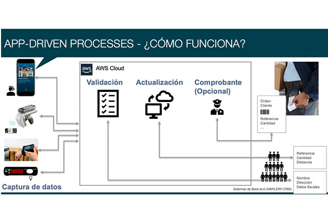 Como se muestra en la siguiente figura, la arquitectura de fondo es muy similar con procesos que se encargan de extraer la información almacenada en los sistemas de back-end (WMS y ERP), realizar la validaciones y transmitir la información a los dispositivos físicos que se empleen en las instalaciones que van desde computadores de mano, lectores y módulos sobre estanterías.